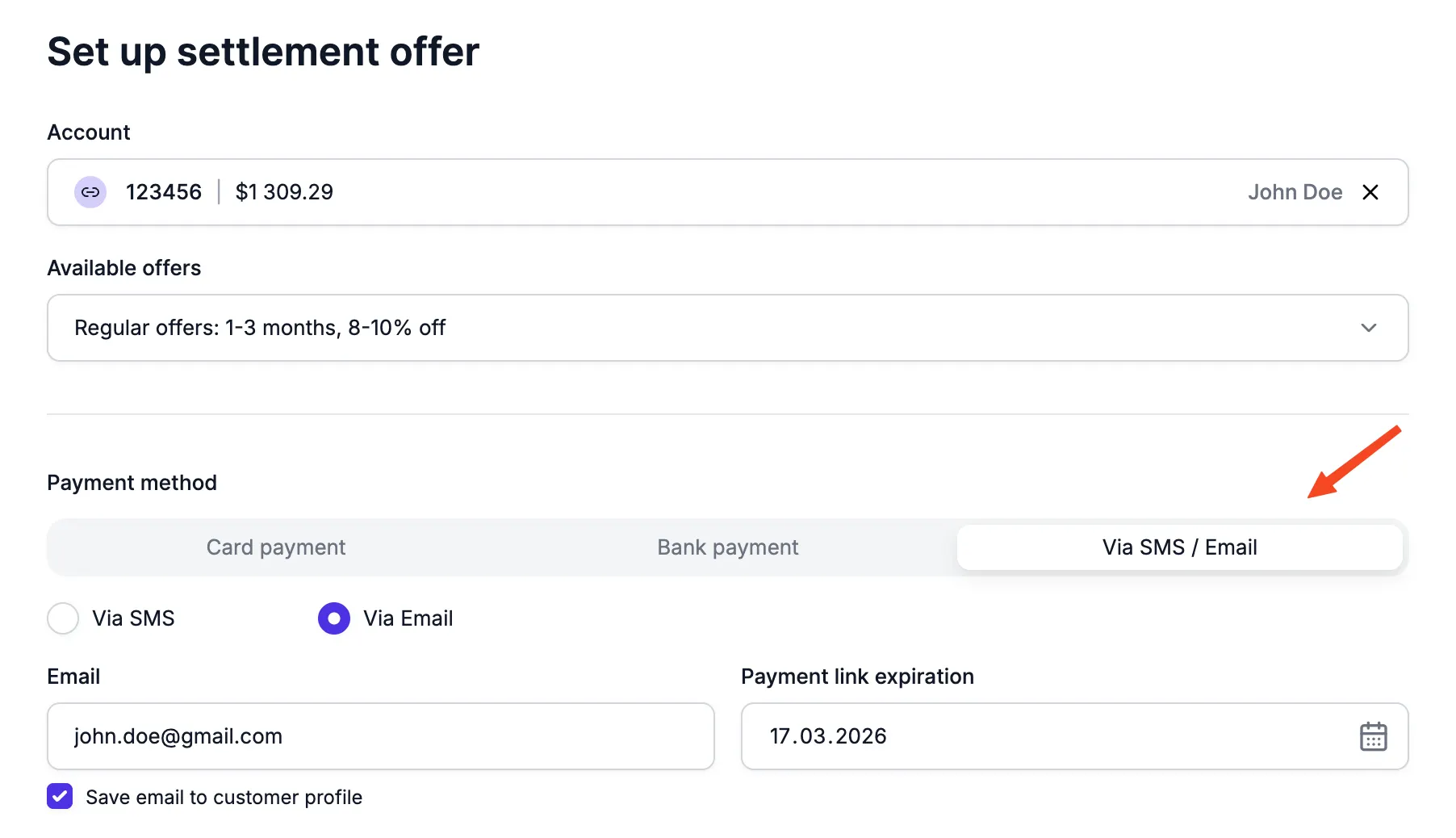 To send it, go to Create Payment > Settlement Offer, select payment method Via SMS/Email and pick desired way to send it.