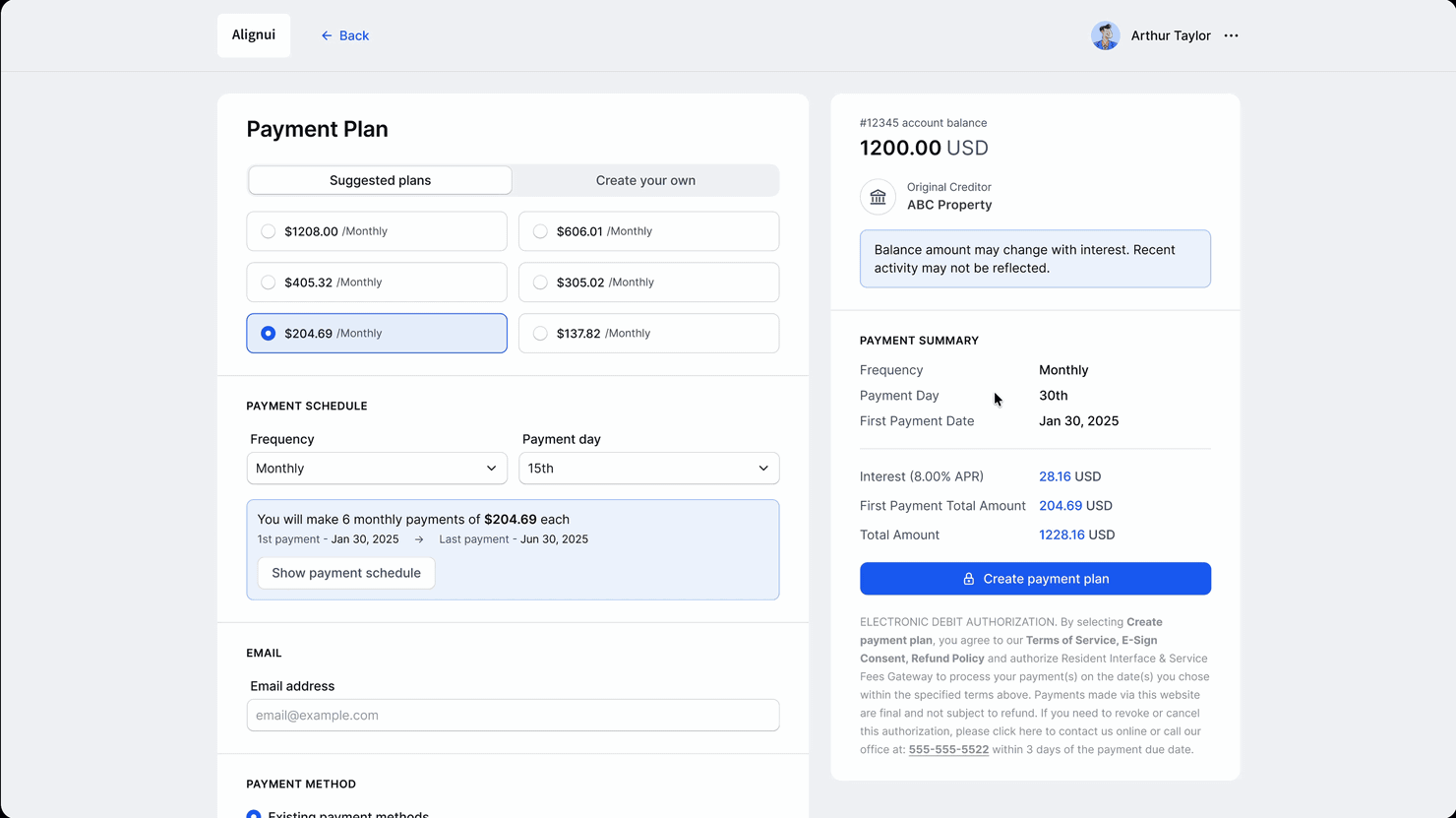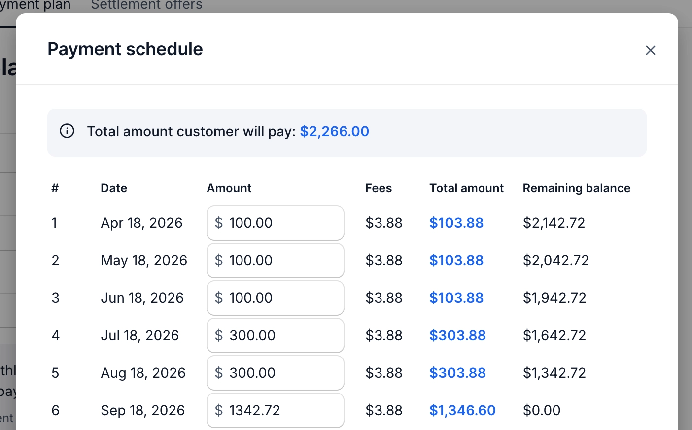 Open the Payment Schedule modal when creating a plan and edit individual amounts. The remaining balance recalculates automatically. Tiered plans are also now available on Settlement Offer checkouts.