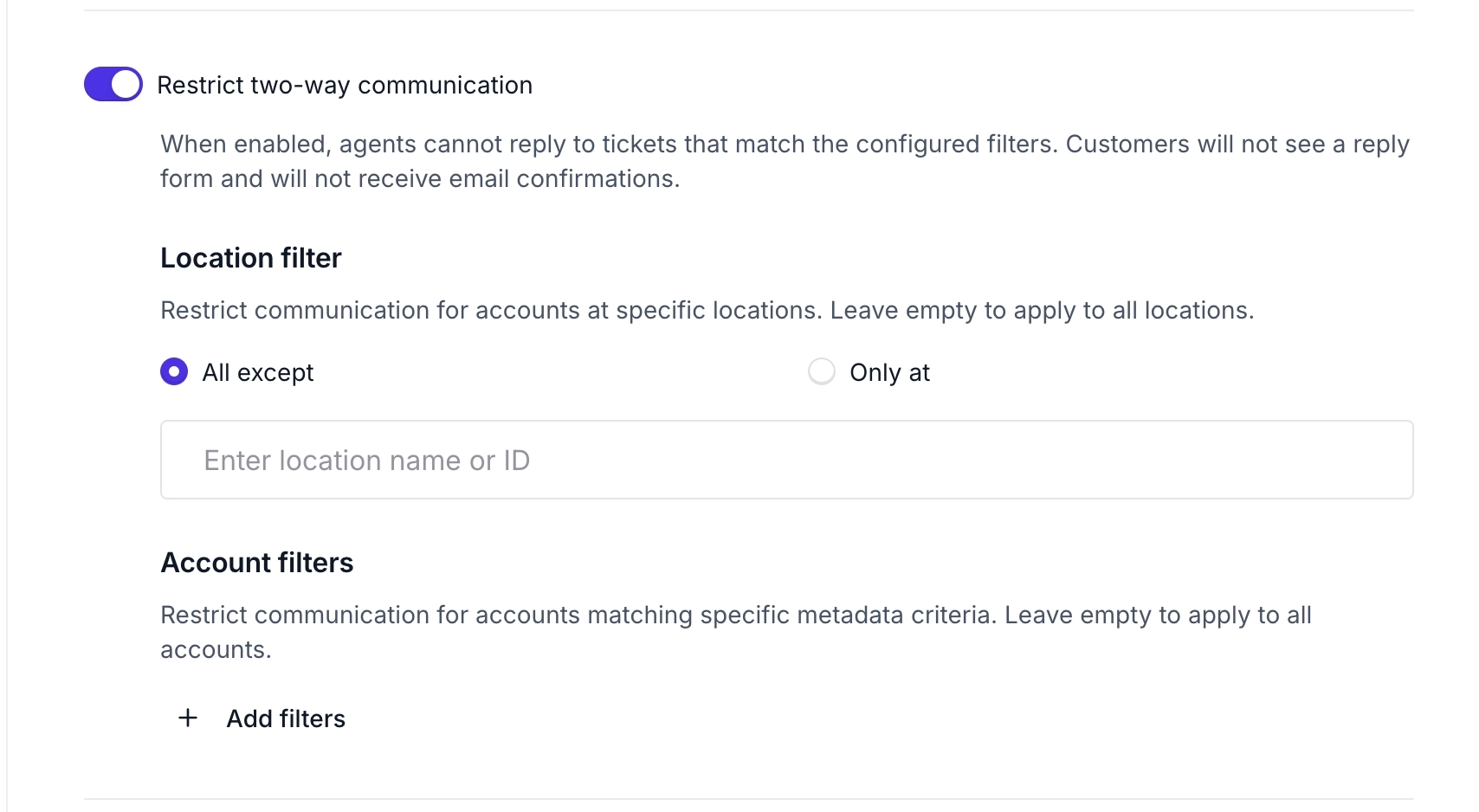 Some creditors require limiting contact for specific accounts. You can now restrict agent replies by location or account metadata while still allowing consumers to submit tickets.