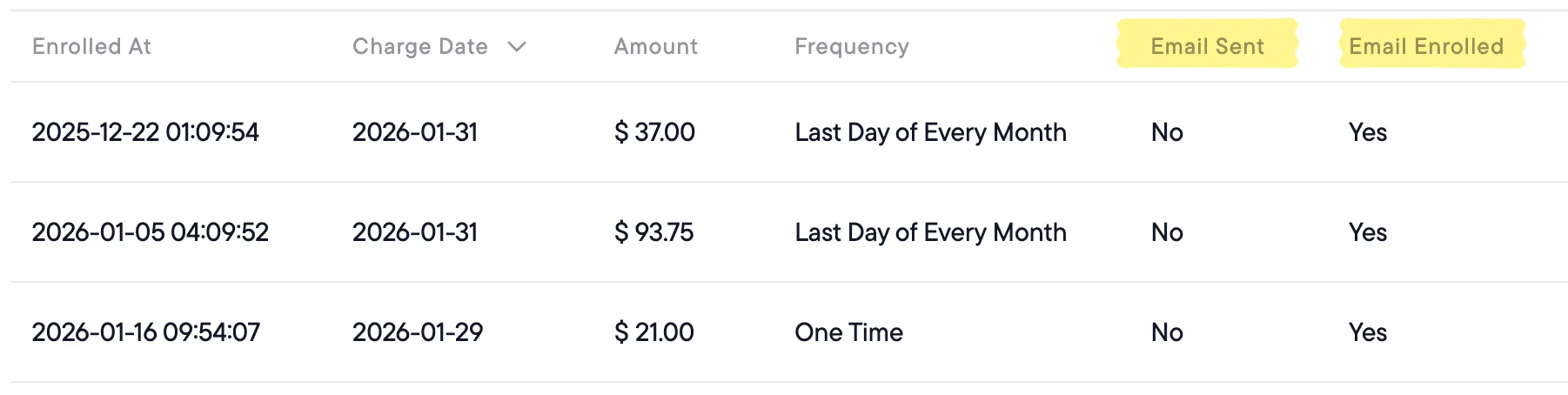 - Scheduled Charges: Email Sent (payment reminders), Email Enrolled*